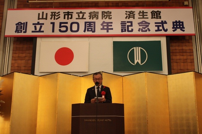 10月3日(木)に山形グランンドホテルにおいて、山形市立病院済生館 創立150周年記念式典を、ご来賓、関係者を合わせ約150名の方々が参加し挙行しました。式典は、佐藤 孝弘 山形市長の式辞に始まり、吉村 美栄子 山形県知事(代理 地主 徹 村山総合支庁長)、長谷川 幸司 山形市議会議長、永瀬 智 山形大学医学部長、石井 直人 東北大学医学部長からご祝辞を賜りました。